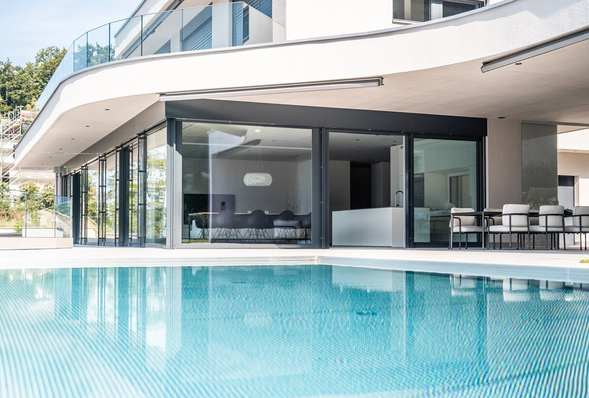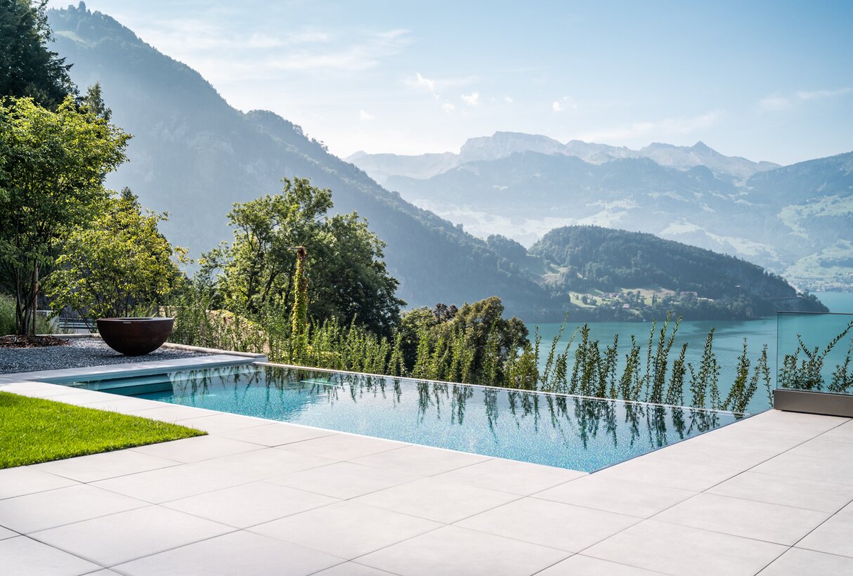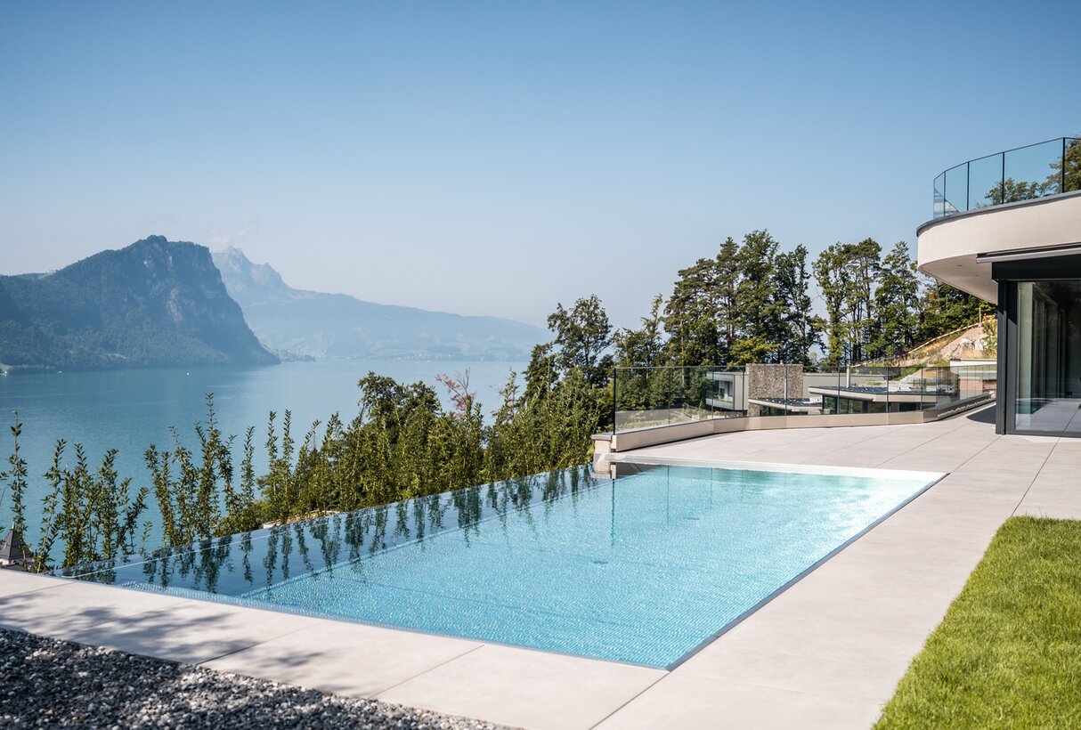Das Objekt über dem Vierwaldstättersee ist ganz auf das herrliche Panorama ausgerichtet, das sich an dieser exklusiven Lage bietet. Nichts trübt den Blick in die Ferne und in der Architektur gibt Transparenz den Ton an: Brüstungen und Treppengeländer sind ebenso aus Glas wie die Frontseite des Pools. Der Architekt hatte eine klare Vorstellung, wie das geplante Aussenschwimmbad aussehen sollte: Ein Pool, der sich an die Gesamtarchitektur in Stil, Materialwahl und Wertigkeit anpasst; der lang und schmal zum Schwimmen einlädt. Es sollte ein Pool wer den, der sich nicht aufdrängt, sondern sich als Teil des Ganzen versteht.