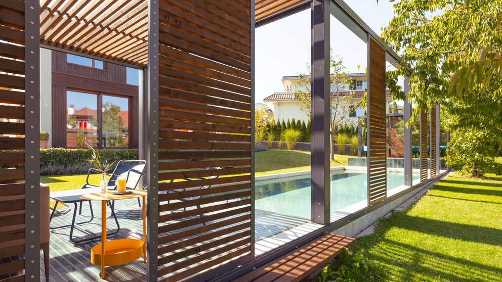 Das Objekt über dem Vierwaldstättersee ist ganz auf das herrliche Panorama ausgerichtet, das sich an dieser exklusiven Lage bietet. Nichts trübt den Blick in die Ferne und in der Architektur gibt Transparenz den Ton an: Brüstungen und Treppengeländer sind ebenso aus Glas wie die Frontseite des Pools. Der Architekt hatte eine klare Vorstellung, wie das geplante Aussenschwimmbad aussehen sollte: Ein Pool, der sich an die Gesamtarchitektur in Stil, Materialwahl und Wertigkeit anpasst; der lang und schmal zum Schwimmen einlädt. Es sollte ein Pool wer den, der sich nicht aufdrängt, sondern sich als Teil des Ganzen versteht.