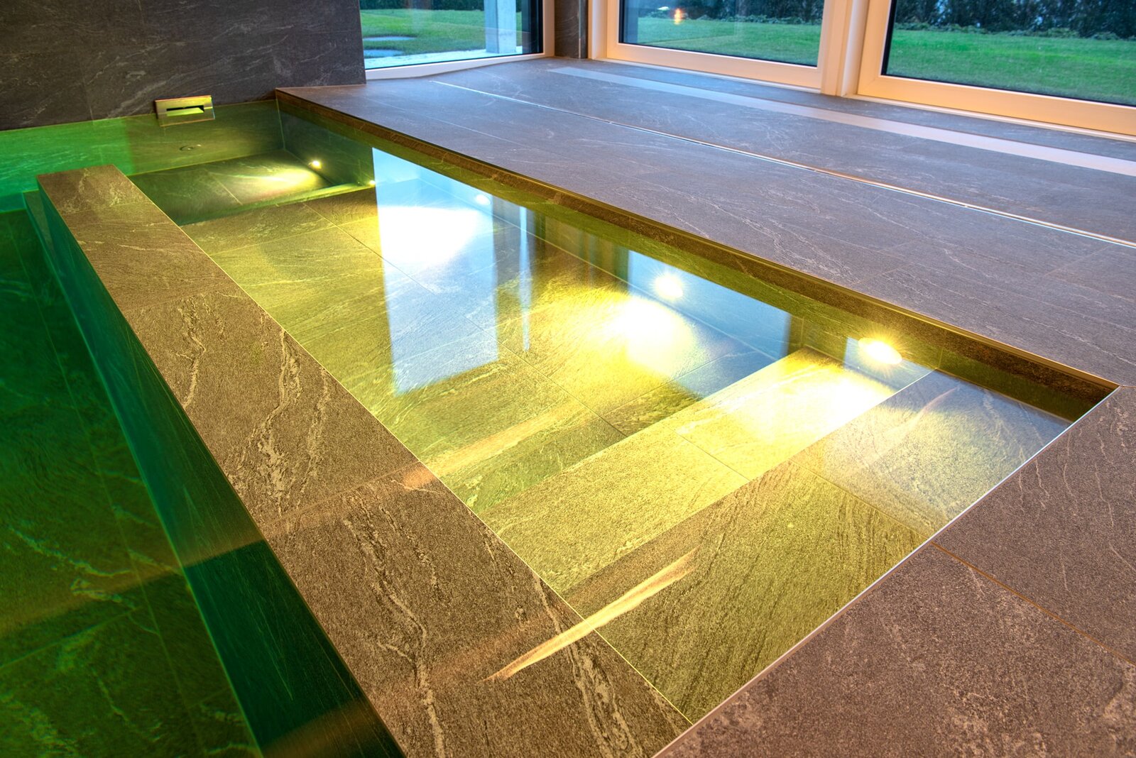 Bei der Beleuchtung gibt es eine Vielzahl von Lösungen. Insbesondere LED-Unterwasserscheinwerfer sind dank ihrer dezenten, aber gezielten Mehrwinkelstrahl-Ausleuchtung beliebt. Sie erstrahlen auf Wunsch in verschiedenen Farben und haben gegenüber herkömmlichen Unterwasserleuchten eine kurze Amortisationsdauer.