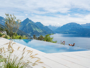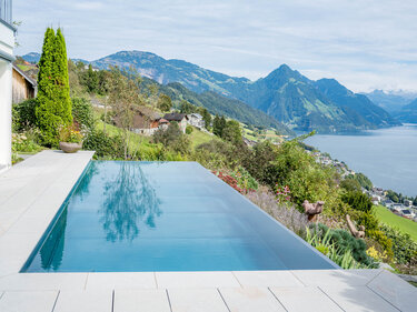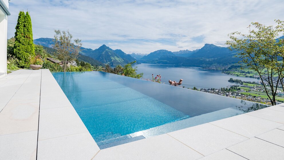 Dieser exklusive Edelstahlpool lädt mit seiner klaren Formensprache und der überlaufenden Wasserlinie zum Träumen ein. Die raffiniert integrierte Technik bleibt dezent im Hintergrund, während der Blick frei über den glitzernden See und die imposante Bergkulisse schweift. Die schwebende Treppe, kombiniert mit einer dezenten Sitzbank, macht jedes Eintauchen zum stilvollen Ritual. Ein Pool, der nicht nur kühlt – sondern bewegt.